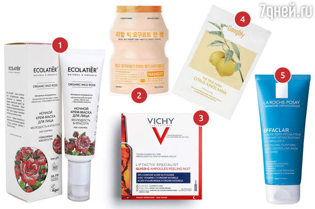 1. Ночной крем-маска Organic Wild Rose ECOLATIER. 2. Маска для лица A’Pieu yogurt с экстрактом манго. 3. Сыворотка-пилинг ночного действия в ампулах Liftactiv Specialist Glyco-C Vichy. 4. Маска для лица Gangbly с экстрактом юдзу. 5. Очищающая матирующая маска для жирной проблемной кожи EFFACLAR La Roche-Posay.