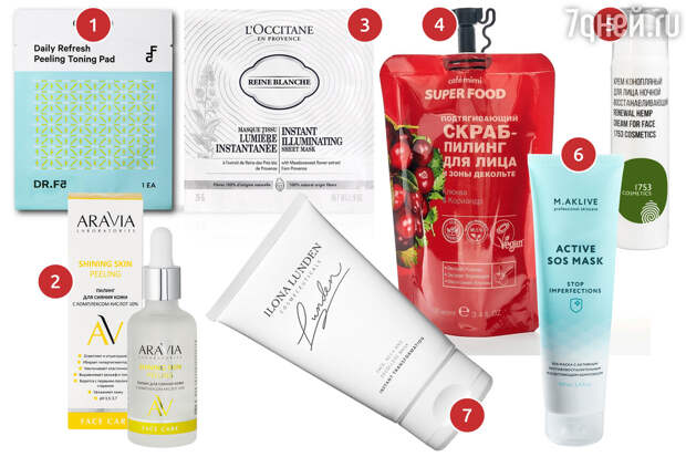 1. Пилинг-пэды для сияния кожи Dr. F5. 2. Сыворотка для сияния кожи Aravia. 3. Маска мгновенное сияния "Белая королева" L'Occitane. 4. Подтягивающий скраб-пилинг для лица и зоны декольте "Клюква&кориандр" Cafe mimi. 5. Восстанавливающий ночной крем с конопляным маслом 1753 Cosmetics. 6. Активная SOS маска «борьба с несовершенствами» M.Aklive. 7. Маска для лица, шеи и декольте Ilona Lunden.