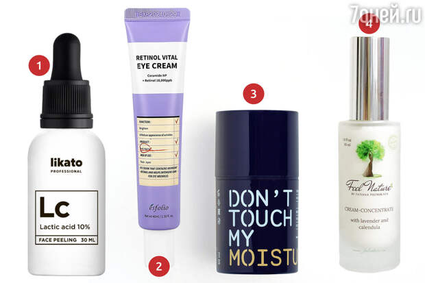 1. Пилинг для лица Likato. 2. Крем для контура глаз разглаживающий ESFOLIO. 3. Ночной крем для лица Don't touch my mousturizer. 4. Крем-концентрат с лавандой и календулой Feel Nature.