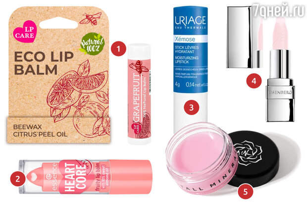 1. Бальзам для губ "Грейпфрут" LP CARE ECO. 2. Бальзам для губ в стике Heart Core fruity lip balm essence. 3. Увлажняющий бальзам для губ Uriage. 4. Бальзам для губ Baume Fusion Eisenberg. 5. Бальзам для губ Pure Lip Oil Balm Kristall Minerals cosmetics.