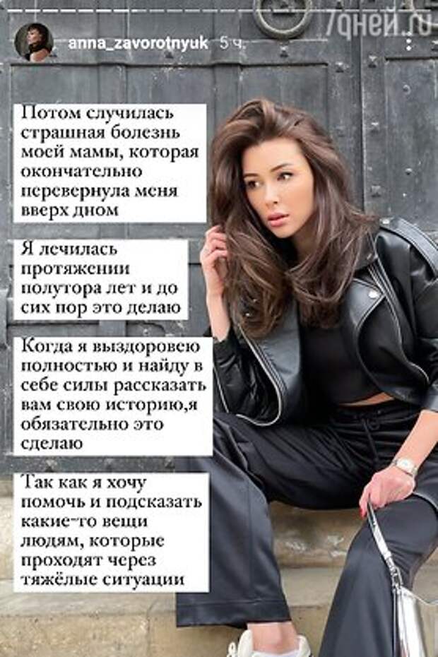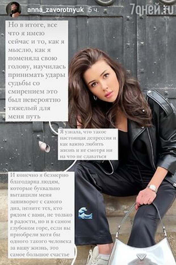 Анна рассказала, что на фоне болезни мамы и проблем с работой у неё началась депрессия, справиться с которой ей помогли близкие, которые буквально «вытащили её за шиворот с самого дна». Заворотнюк рассказала, что обратилась за помощью к специалисту и прошла тяжелый путь по работе над собой и взглядами на жизнь.