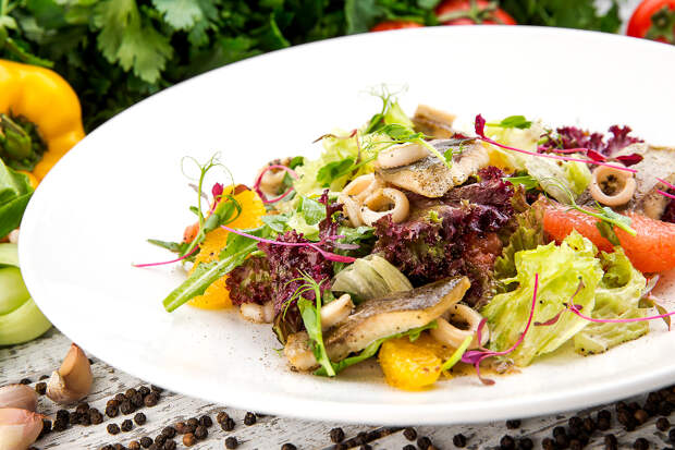 - Микс салат соединяем с сегментами апельсина и грейпфрута.
