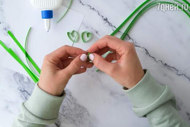 Форма сердца получается, если сначала согнуть бумажную полоску пополам. Затем сверните каждый конец к середине, отпустив, когда вы доберетесь до размера, который вы хотите получить. Сделайте несколько таких сердечек - или 8, по примеру с картинки, или больше - по своему желанию и фантазии.