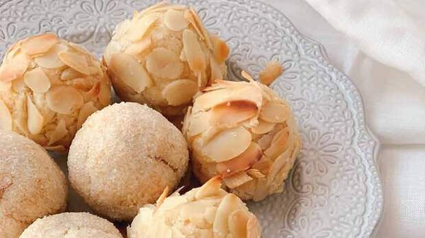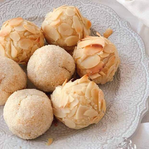 3. Половину шариков обвалять в миндальных лепестках, вторую половину — в сахаре.