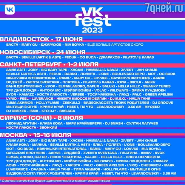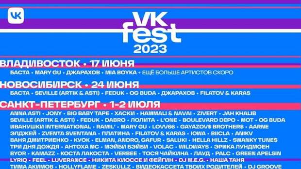 Список исполнителей будет пополняться. Позже будут представлены другие артисты, а также известные спикеры и блогеры. В 2023 году VK Fest станет самым громким развлекательным событием лета — он будет длиться целый месяц и пройдёт в пяти городах страны. Во Владивостоке фестиваль состоится 17 июня, в Новосибирске — 24 июня, в Санкт-Петербурге — 1 и 2 июля, в Сириусе (Сочи) — 8 июля, в Москве — 15 и 16 июля. С этого года билеты на фестиваль доступны на официальном сайте.