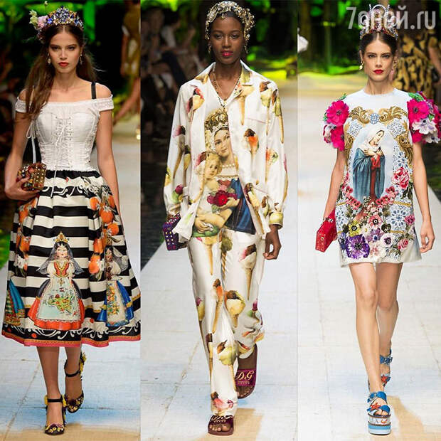 Коллекция носит название «Tropico Italiano». И дефиле проходило посреди тропического леса в импровизированном баре среди экзотических птиц. Кроме макарон и тарелок с морепродуктами, вафельных рожков с мороженым было и немало принтов с ликами Богоматери. В этом, наверное, уже на пляжную вечеринку-то не отправишься! Но и в католический храм не все отважатся пойти...