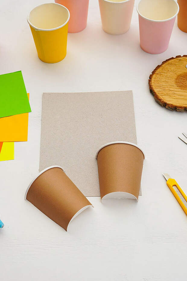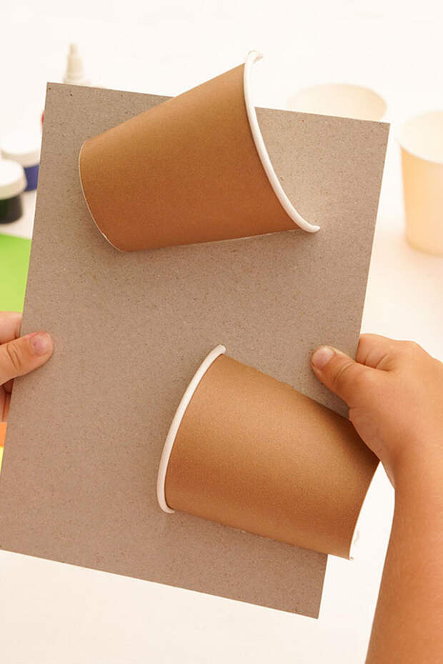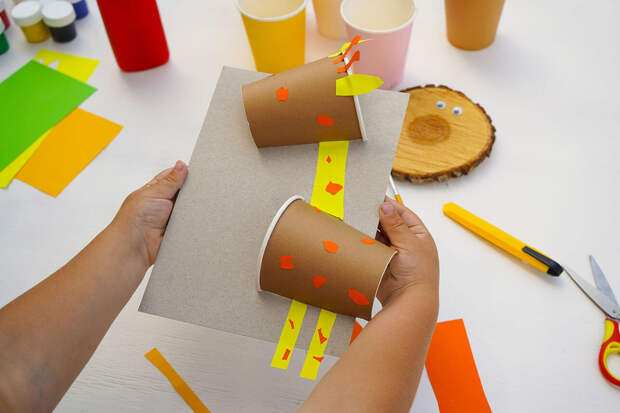 Взрослый помогает разрезать стаканчик пополам, как показано на фото 2. Одна часть станет головой жирафа, а другая — его округлым туловищем. Приклейте эти две детали на картонку, расположив голову выше, как будто жираф смотрит на листву (фото 3 и 4)