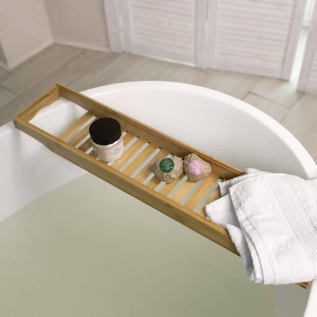 Последний штрих, который превращает купание в ритуал. Раздвижной столик из натурального бамбука укладывается поперек ванны и вмещает все необходимое: свечу, бокал, телефон или книгу. Больше не нужно тянуться к тумбочке или держать что-то в руках. Обработан специальным водоотталкивающим составом, регулируется по длине под любую ванну — аксессуар простой, но именно он создает ощущение релаксации.