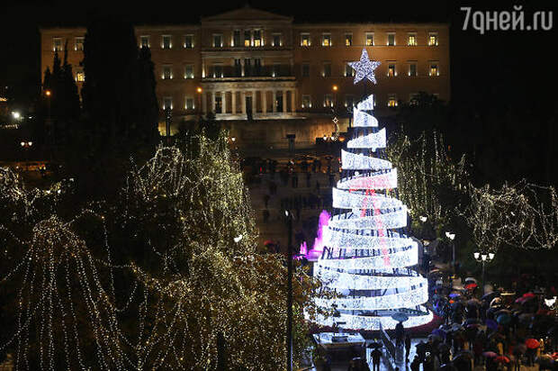 Главная новогодняя елка Греции, сделанная из металла, очень похожа на минское древо, однако, на их форме схожесть заканчивается.