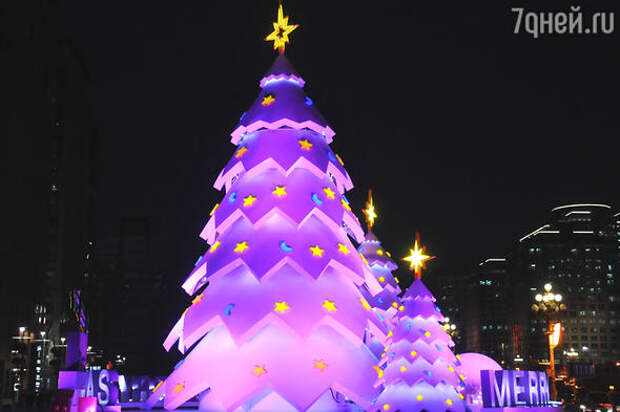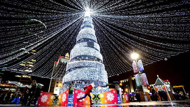 Пекинскую площадь «Донфан» украсили сразу три высокотехнологичных ели (одна большая, и две поменьше), переливающиеся разными цветами — от розового до голубого.