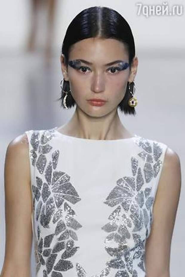 На шоу Tadashi Shoji, опять же, решили не жалеть мерцающего средства, нанося его на веки и растягивая до висков. Конечно, мы не призываем в точности повторять этот прием в повседневной жизни, но положить немного сияющего пигмента в центр века лишним не будет — глаза тут же станут ярче.