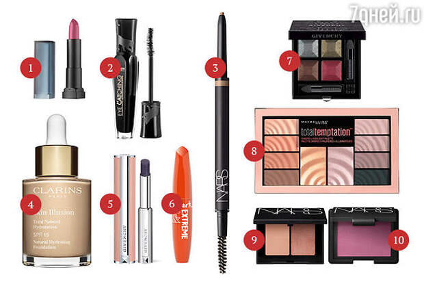 1. Матоваяпомада Color Sensational Powder Matte, Nocturnal Rose, Mybelline NY; 2. Тушьдляресниц Eye Catching, Bourjois; 3. Карандашдлябровей Brow Perfector, Calimyrna, Nars; 4. Тональный крем Skin Illusion, Clarins; 5. Бальзам для губ Rouge Perfecto, №4 Blue Pink, Givenchy; 6. Тушь для ресниц mark. «Объем. Запредельная длина», Avon; 7. Четырехцветные тени для век Midnight Skies Prisme Quatuor, Givenchy; 8. Палетка теней и хайлайтер Total Temptation, Maybelline NY; 9. Двухцветные тени для век Hammamet Duo Eyeshadow, Nars; 10. Румяна Mata Hari Blush, Nars.