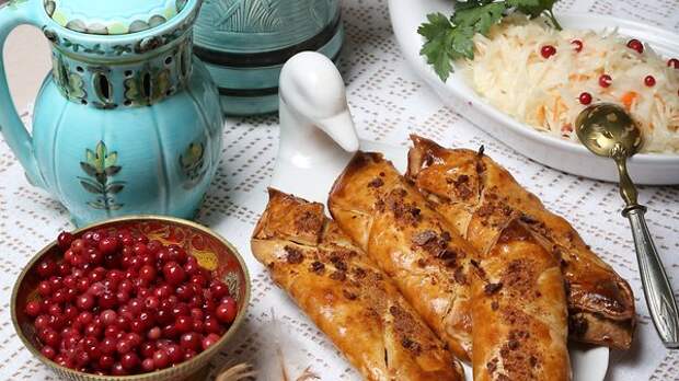 - Раскатываем тесто толщиной 2—3 мм, режем на прямоугольники приблизительно 10 см на 15 см. По диагонали укладываем начинку, примерно 2 столовых ложки. Накрываем начинку с боков, подворачивая уголки вниз. Открытые кончики накрываем вырезанными отдельно ромбиками из теста, таким образом, что бы начинка была полностью закрыта.