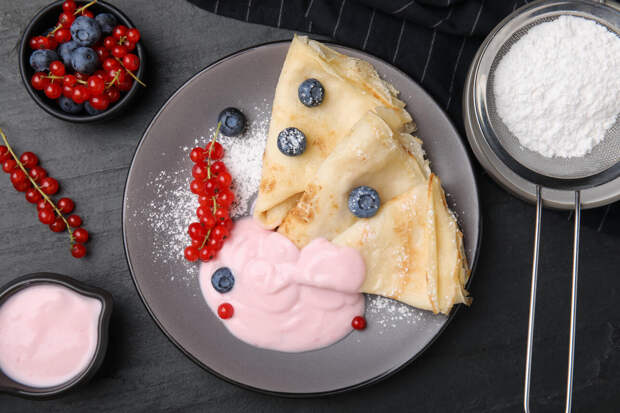 Начинки на основе йогурта лучше готовить в моменте, а не заранее, иначе они дадут лишнюю жидкость. Собирайте блины непосредственно перед подачей.