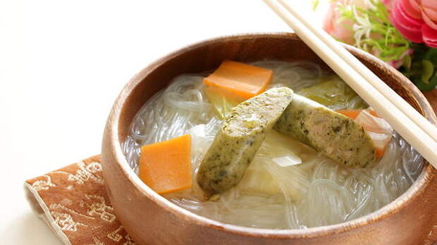 - Обжарить веганские колбаски и красиво положить их сверху на лапшу.