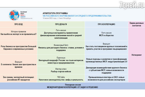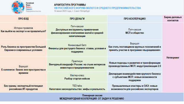Помимо традиционных тематических сессий и дискуссий по вопросам развития сектора МСП, деловая программа Форума будет включать принципиально новые, практико-ориентированные форматы взаимодействия бизнеса и власти — воркшопы, питч-сессии, истории провалов, TED Talks.