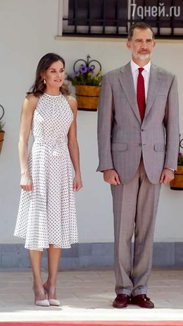 Королева Испании - образец стиля для своих подданных. На днях 45-летняя Летиция сопровождала своего супруга во время поездки в небольшой город на юге страны. Сейчас в Испании очень жарко, поэтому королева отдала предпочтение шелковому сарафану Carolina Herrera.