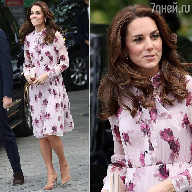 Кейт Миддлтон чаще всего выбирает для своих выходов однотонные вещи: платья, пальто, плащи, костюмы. И нарядов в цветочек в её гардеробе не так уж много. Поэтому нежное шифоновое платье за 498 долларов с розочками с длинными рукавами и небольшим бантом на шее, в шее, в которое нарядилась герцогиня Кембриджская, тутже попало в поле зрения мировой прессы.