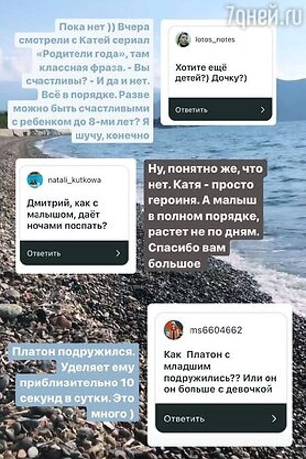 «Пока нет! Вчера смотрели с Катей сериал «Родители года». Там классная фраза: «Вы счастливы? – И да, и нет. Все в порядке. Разве можно быть счастливыми с ребенком до 8 лет?» Я шучу, конечно»,