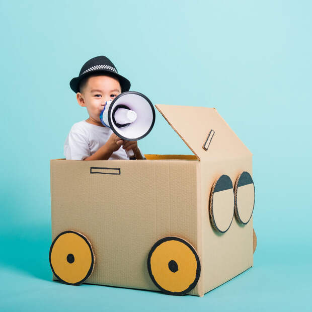 Машина: Нарисуйте на коробке окна, двери, вырежьте из плотного картона колеса и приклейте их к основанию коробки — и вот уже получился транспорт для путешествия или гонок.