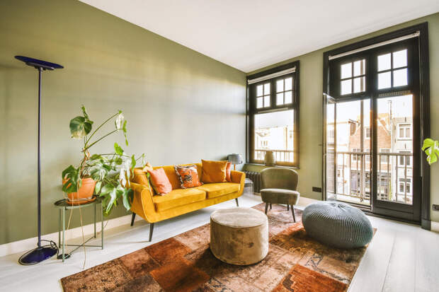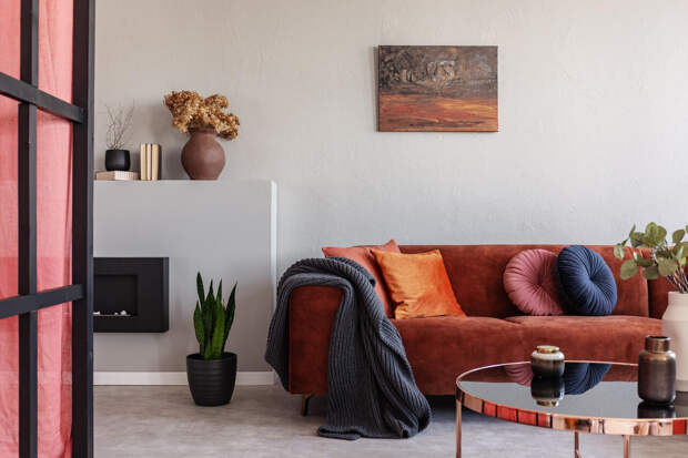 После долгих лет пастельных и припыленных оттенков в интерьер приходит настоящая насыщенность: в 2026 году популярны яркие и сложные оттенки – от шафрана и баклажана до свежего василькового и глухого лилового. Они работают в дуэте с темным деревом, камнем, терракотой и латунью.