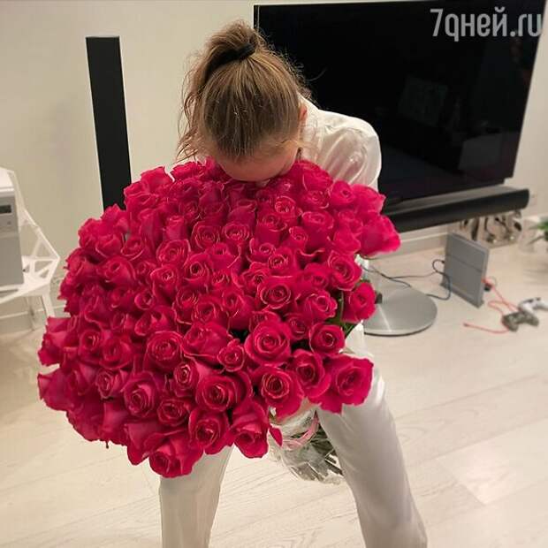 Счастливая артистка поделилась своим счастьем с публикой. В описании фото для Инстаграма, на которых она с трудом держит в руках большую охапку роз, она написала: