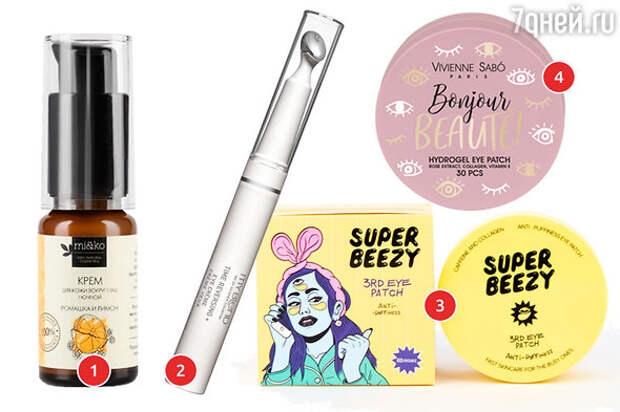 1. Крем для глаз "Ромашка и лимон" Mi&KO. 2. Крем для кожи вокруг глаз против морщин, темных кругов и отеков My Blend Time Reversing 3. Золотистые гидрогелевые патчис кофеином, коллагеном и золотом Super Beezy. 4. Гдрогелевые патчи Bonjour Vivienne Sabo.