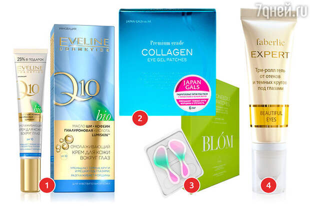 1. Крем против темных кругов и отеков под глазами Q10 bio Eveline. 2. Гидрогелевые патчи с коллагеном Japan Gals 3. Микроигольные патчи с янтарной кислотой BLOM. 4. Три-ролл гель от отеков и темных кругов под глазами Faberlic Expert.