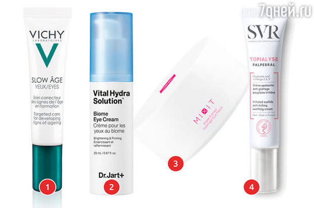1. Укрепляющий уход для контура глаз против признаков старения SLOW AGE Vichy. 2 Крем для области вокруг глаз Vital Hydra Solution Dr Jart+. 3. Гидрогелевые патчи с ирландским мхом и ламинарией Mixit. 4. Крем для области глаз TOPIALYSE SVR.