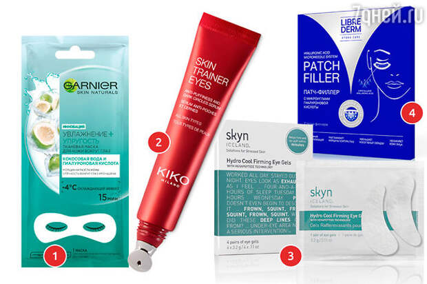 1. Тканевая маска для кожи вокруг глаз "Увлажнение + Упругость" Garnier. 2. Сыворотка для глаз с тонизирующим эффектом KIKO MILANO. 3. Патчи для глаз Hydro Cool Firming Eyes Skyn Iceland. 4. Патчи для глаз с микроиглами Librederm.