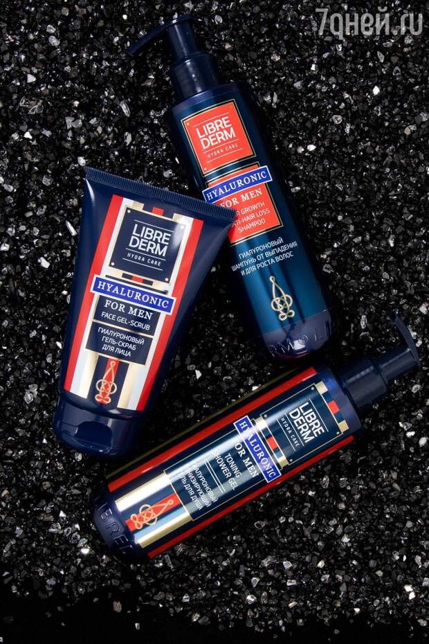 Гель-скраб, шампунь против выпадения и гель для душа с гиалуроновой кислотой и пантенолом очищают, питают и увлажняют кожу.