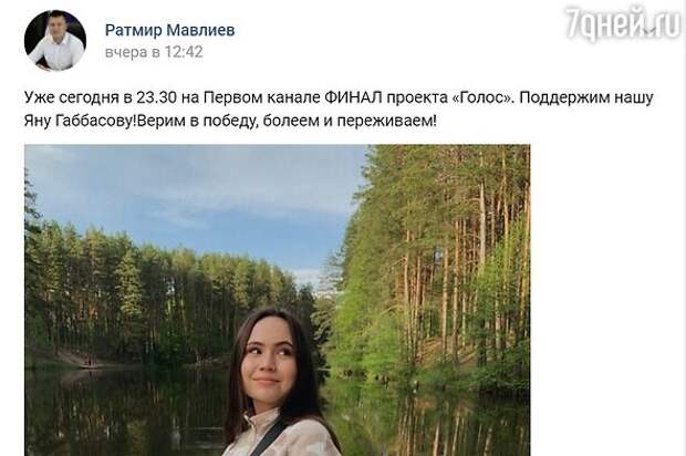 «Яна Габбасова — победитель проекта «Голос» на Первом канале. Лучший голос страны! Молодец! Поздравляем! Гордимся! Всем огромное спасибо за вашу поддержку!» — эмоционально поздравил девушку Мавлиев сразу после объявления результатов финала «Голоса».