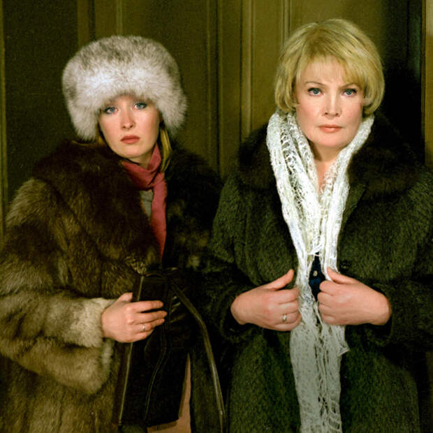 У главных героинь картины «Валентин и Валентина» в исполнении Татьяны Дорониной и Ларисы Удовиченко типичные меховые изделия СССР середины 1980-х годов. Отличная иллюстрация моды того времени. Шубы из натурального меха однотипного фасона, довольно громоздкие, массивные и тяжелые. Отметим и аксессуары. Шапка из светлого песца подобной формы у Удовиченко — очень модный элемент той поры, как и белый оренбургский пуховый платок на шее Дорониной.