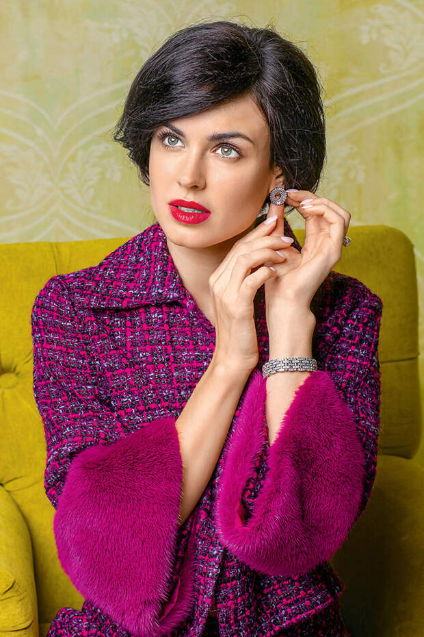 Первый тренд. Если вы высокая и стройная женщина, как Олеся Судзиловская, то можете без каких-либо сомнений носить пушистый белый мех, который освежит ваш образ, сделает его воздушнее, мягче. Но помните о том, что мех с длинным ворсом, как на полушубке у актрисы, добавляет объема. Поэтому тем, кто имеет лишние килограммы, с ним лучше дела не иметь. Очень темный мех, казалось бы, безопаснее, но у него тоже есть свои характерные особенности. Он делает черты лица резче. К тому же сегодня в тренде шубы именно из белого меха, как на подиуме. С чем их предлагают носить? В первую очередь с нарядными и вечерними платьями в праздники, а также с брюками и свитерами — на каждый день. Главный совет: не допускайте контрастов, не подбирайте к таким шубам одежду темного цвета. Уж если и играть в Снегурочку, то по всем правилам!