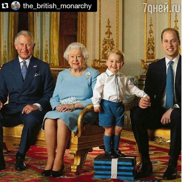На фотографии представлено сразу четыре поколения монархического семейства: Елизавета II, принц Чарльз, принц Уильям и маленький принц Джордж. Двухлетний сын Кейт Миддлтон занял почетное место между британской королевой и своим папой. Улыбающийся принц Джордж, стоящий на специальной подставке в виде книг, в считанные минуты покорил сердца британцев. Для уверенности мальчик держится ручкой за своего папу — принца Уильяма. Любопытно, что два года назад королевское семейство уже фотографировалось в точно таком же составе, правда принц Джордж тогда был совсем маленьким и лежал на руках у папы.