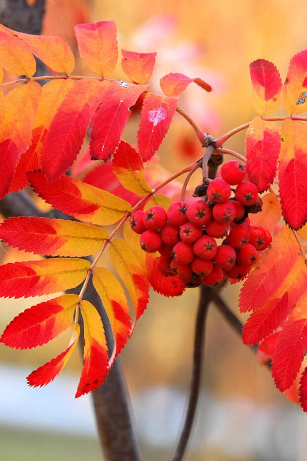Рябина. У этого дерева сложные листья: на одном черенке сидит много маленьких узких листочков-перышек. Их легко узнать.