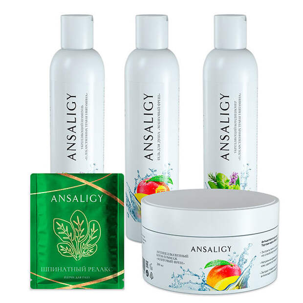 К уходу за телом ANSALIGY подошли не менее основательно и выпустили два продукта, отвечающих за гладкость и упругость кожи: антицеллюлитный крем-гоммаж и гель для душа. Оба с тонким ароматом манго и нежной текстурой! С целлюлитом в гоммаже борются сразу два ингредиента — экстракт зеленого кофе и имбиря, а за эластичность и увлажнение в геле для душа отвечают экстракт манго и масло персика.