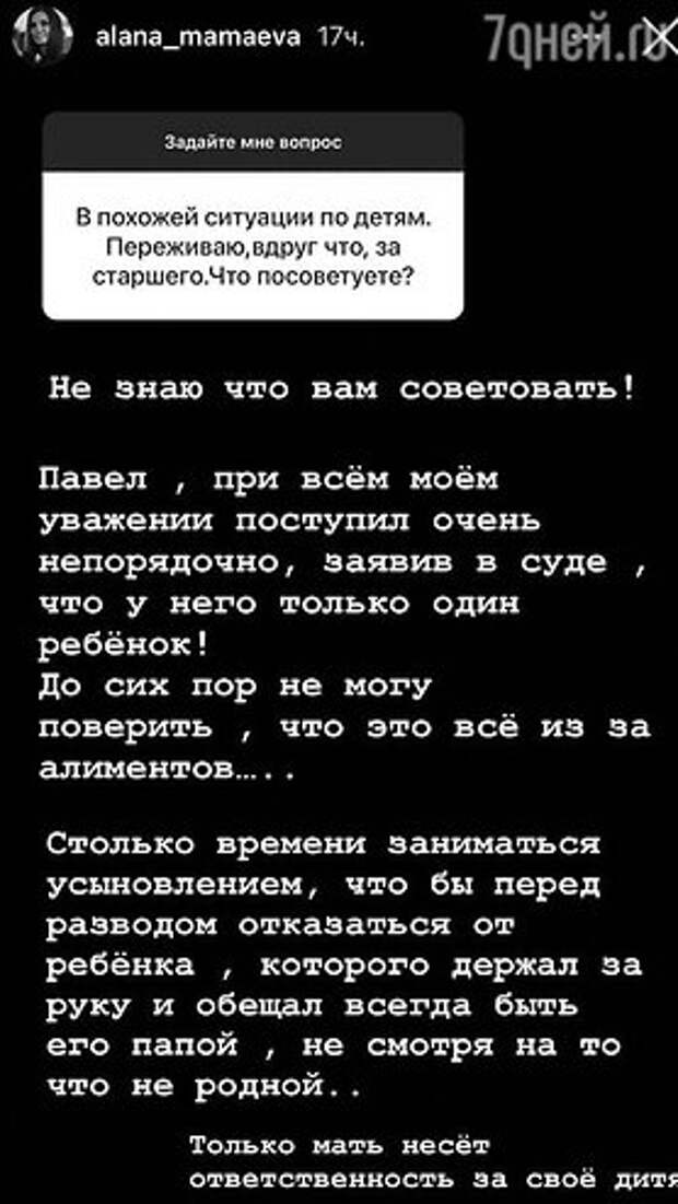 «Павел поступил очень непорядочно, заявив в суде, что у него только один ребенок. До сих пор не могу поверить, что это все из-за алиментов… Столько времени заниматься усыновлением, чтобы перед разводом отказаться от ребенка, которого держал за руку и которому обещал всегда быть папой, несмотря на то, что неродной. Только мать несет ответственность за свое дитя»,