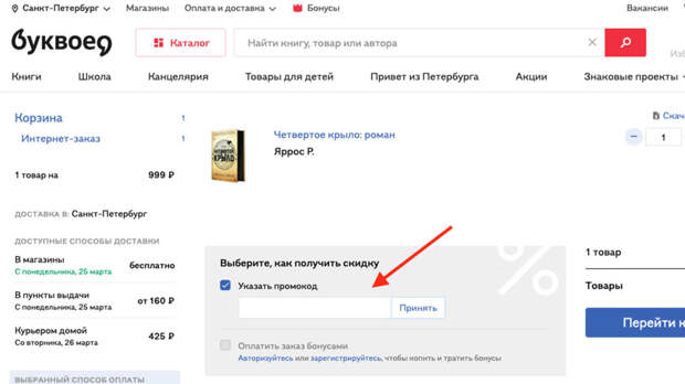 Экономить на книгах можно также с помощью промокодов, которые дают скидку от 10% до 30%. Для этого при оформлении заказа в корзине поставьте галочку «Указать промокод» и введите туда код купона на скидку.