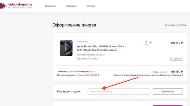 Для выгодных покупок используйте также промокоды. Они могут давать процентную или фиксированную скидку на товар. Применить код очень просто — скопируйте его и вставьте в соответствующее поле в корзине при оформлении покупки.