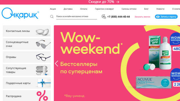 Компания постоянно проводит акции, которые собраны на сайте в специальном разделе. Например, сейчас можно заказать контактные линзы со скидкой до 35% , купить оправы и аксессуары с выгодой до 70%.