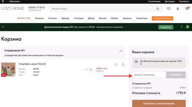 Чтобы выгодно купить товары для дома, используйте также промокоды. Введите код купона при оформлении заказа в корзине, и сумма товара будет пересчитана с учетом скидки.