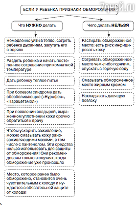 Различают 4 степени обморожения. 1-я степень характеризуется онемением и побледнением кожи. При 2-й и остальных отмечаются посинение, волдыри и некроз кожи. С обморожением 1-й степени вы можете справиться и без врача, в остальных случаях нужно обязательно показать ребенка врачу.