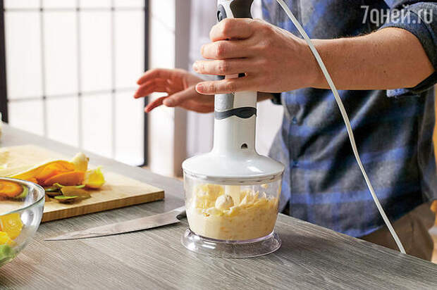 Приготовить крем: бананы очистить, сложить в куттер (измельчитель), влить сгущенку и перебить.