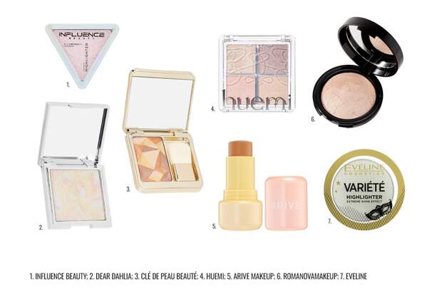 Нанесите хайлайтер на скулы, во внутренние уголки глаз, на спинку носа — и блестки начнут играть в лучах. Кожа будет выглядеть свежее и отдохнувшей. По желанию добавьте легкое сияние на открытые участки тела: ключицы или декольте — это сделает образ цельным.
