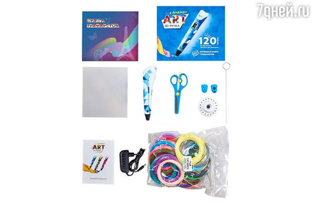 В набор, помимо 3D-ручки, входит все необходимое для занятий 3D-рисованием. Это целых 120 метров пластика PLA, которого хватит очень надолго, книга трафаретов, специальный коврик для 3D-рисования, силиконовые напальчники, ножницы, подставка для 3D-ручки и даже шомпол для чистки ручки на случай ее засорения.