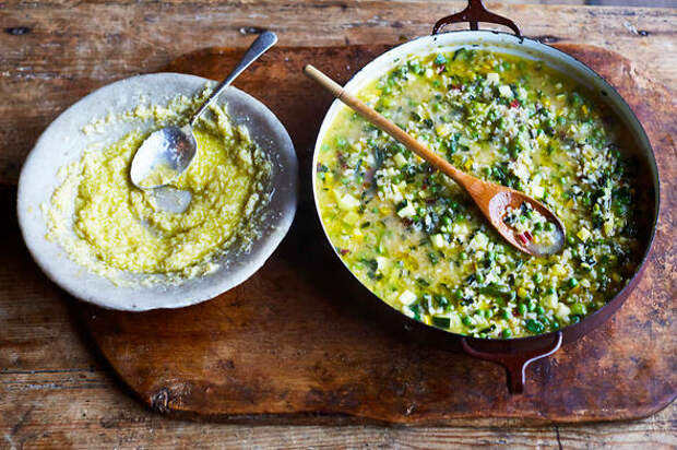 Свежий и яркий суп с лимонным песто и сезонными овощами из новой книги Оливера «Джейми готовит в «Италии» (КукБукс).