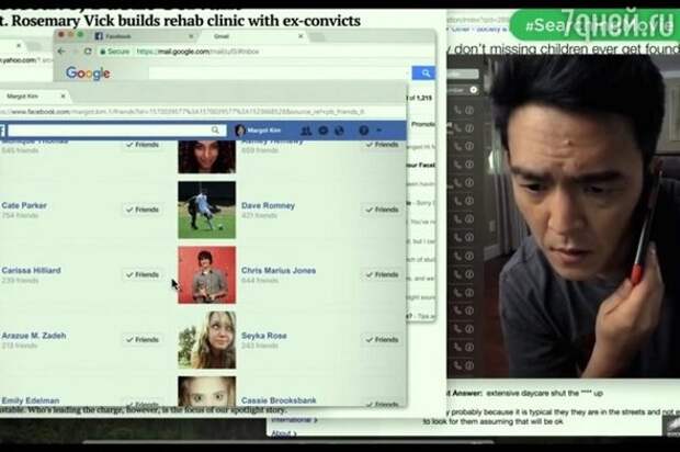 Детективный триллер от студии Тимура Бекмамбетова снят в необычном жанре screen-life – все события фильма развиваются на экранах различных устройств. После школы дочка Дэвида Кима не возвращается домой. Никто из друзей не знает, где она находится, и отец заявляет в полицию. Чтобы помочь с расследованием, Дэвид взламывает ноутбук Марго. Он погружается в интернет-жизнь своей дочери и постепенно осознает, что совсем ее не знал.