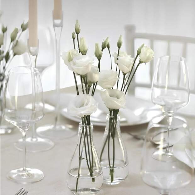 Эстетично завершить сервировку можно при помощи цветочных композиций в светлых тонах. Объемные букеты будут мешать общению, поэтому рекомендую расставить одиночные цветки по колбам или маленьким вазам. Для поддержания оттенка Cloud Dancer подойдут цветы в естественной, немного приглушенной палитре цветов. Это могут быть нежно-кремовые диантусы, белые маттиолы или альстромерии в пастельной гамме. Добавить свежести им помогут зеленые веточки эвкалипта и питтоспорума.