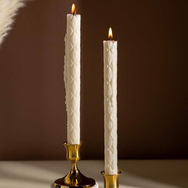 Главный помощник в создании романтической атмосферы — точечный мерцающий свет. Лучше всего с этой задачей справляются свечи. Для гармоничной сервировки рекомендую выбирать подсвечники из матовой керамики, гипса, состаренного металла в тон или на полтона светлее скатерти. Можно оформить композицию из одной высокой тонкой свечи и трех-четырех низких — это создаст объем и динамику. Также в центре стола хорошо будет смотреться гирлянда с теплым светом.
